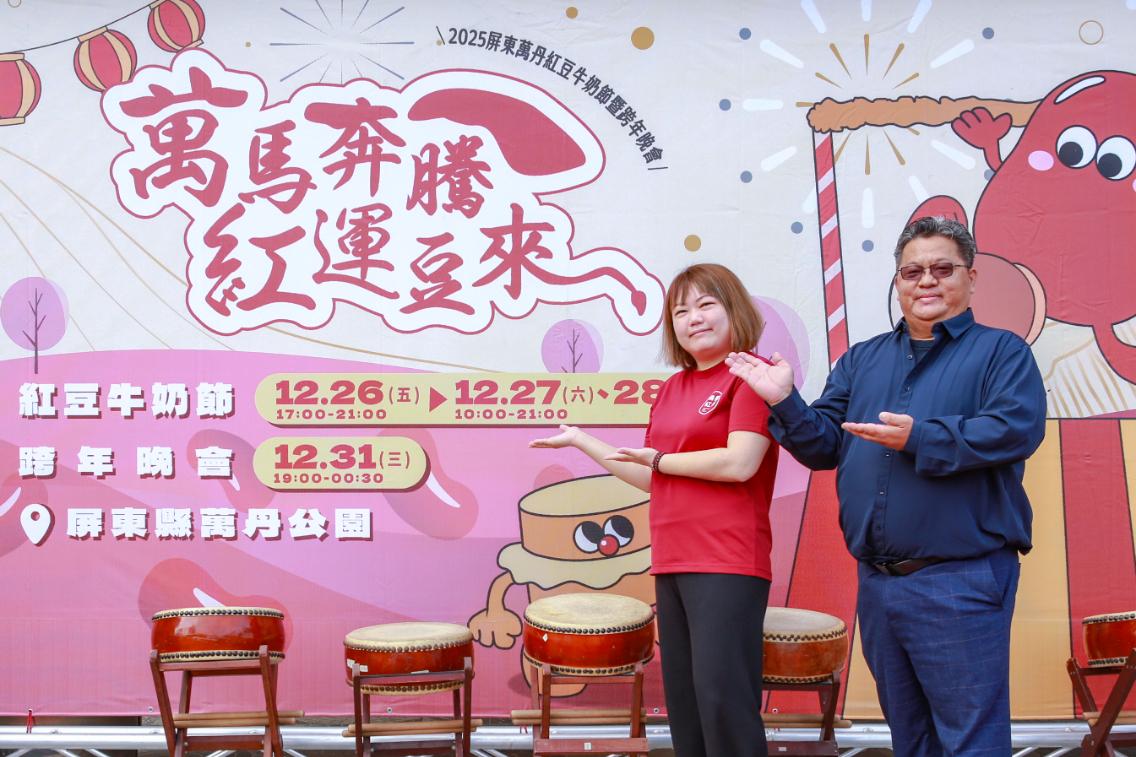 一年一度的「萬丹紅豆牛奶節」於今(12/16)日熱鬧舉辦記者會!以「萬馬奔騰・紅運豆來」為主題,結合農業文化、地方故事、觀光產業與節慶氛圍四大元素,打造屬於萬丹的冬季慶典啟動儀式於萬丹鄉公所共同舉行,邀請在地民眾、青農代表、學校團體與旅外鄉親齊聚一堂,透過烙印紅豆餅傳遞「甜蜜返鄉・幸福萬丹」概念,象徵紅豆香氣串起人與鄉的甜蜜連結。