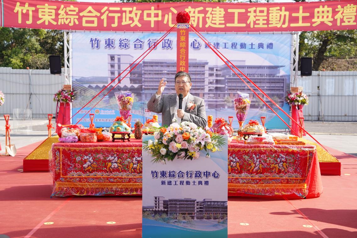 新竹縣政府歷時兩年多籌備「竹東綜合行政中心新建工程」,12月16日上午舉行開工動土典禮。縣長楊文科表示,竹東綜合行政中心分AB兩棟,為地上6層的建築物,這塊腹地串聯大禾埕廣場、轉運站,未來還有圖書館等設施,將成為竹東發展的核心,感謝鎮公所及各級民代全力以赴爭取經費,期待工程如期如質,能夠在2028年完工啟用。