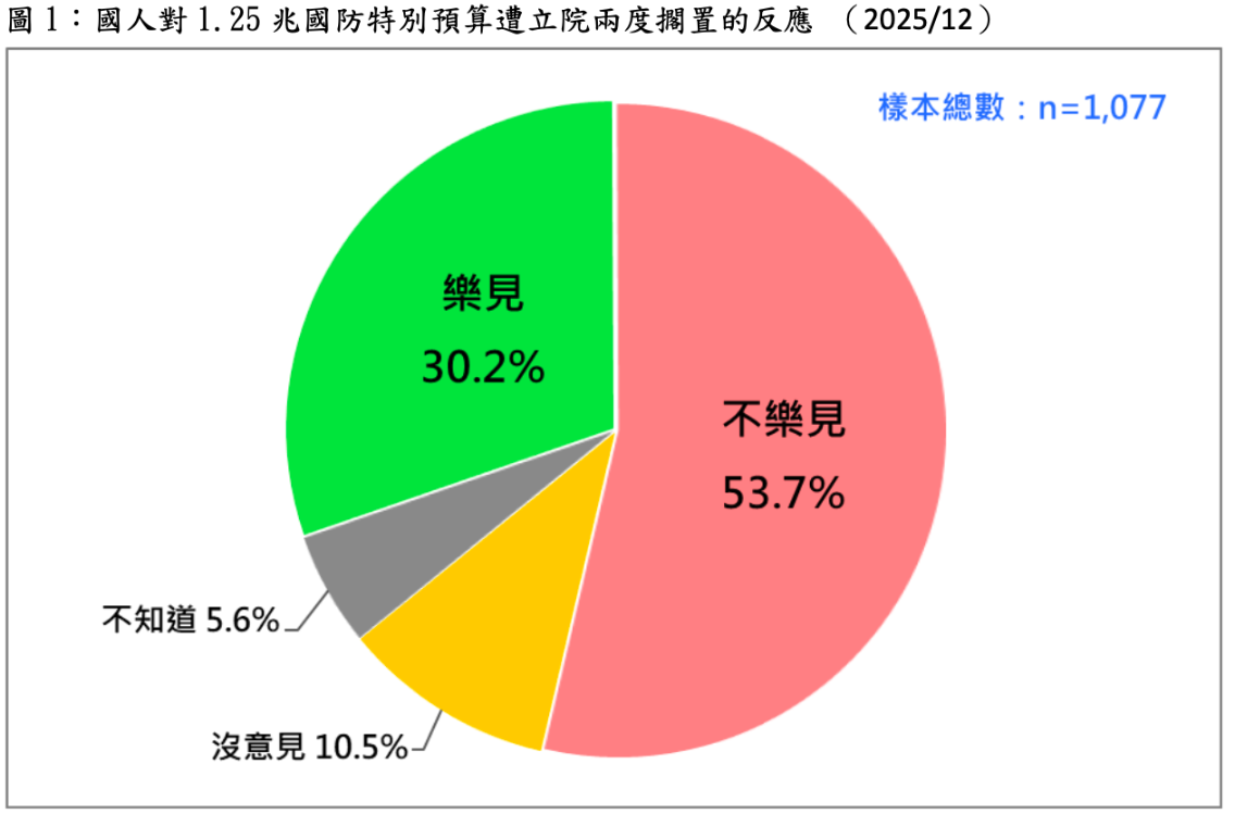 台灣民意基金會今天(22)日發表「國人對1.25兆國防特別預算遭立院擱置的反應 」即時民調顯示,三成樂見暫緩列案,五成四不樂見。不樂見者比樂見者多23.5%。