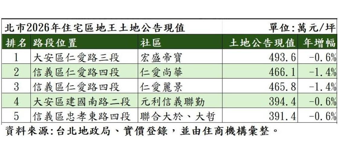 台北市政府地政局近日公布,2026年公告土地現值的住宅區「地王」寶座,依舊由豪宅「宏盛帝寶」拿下,這已是該社區第15年蟬聯。大家房屋企劃研究室公關主任賴志昶分析,地段仍是房市王道,令住宅地王前五名寶座紋風不動,惟五處豪宅土地公告現值罕見全數呈現跌幅,顯示受市場衝擊影響,官方對蛋黃區土地價值態度也轉趨保守。