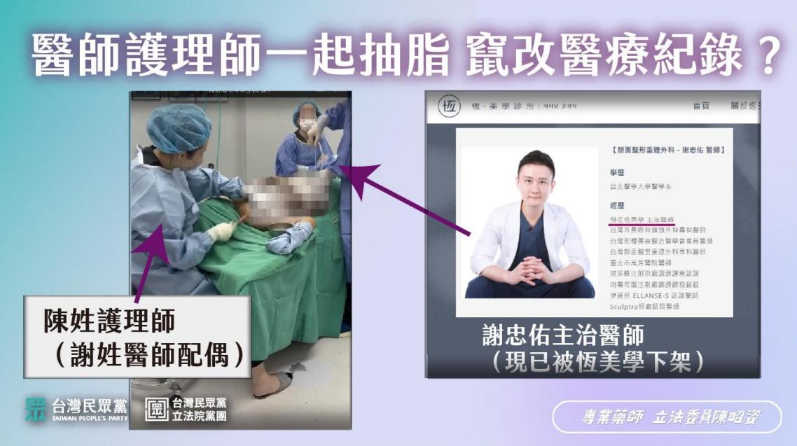 醫美產業再度爆出重大違法爭議。民眾黨立委陳昭姿24日上午召開記者會,公開檢舉疑似醫美診所違法施術情形,指出有吹哨者提供關鍵影片與資料,顯示在抽脂等侵入性手術過程中,實際操作醫療器械者並非醫師,而是具護理師身分的人員。