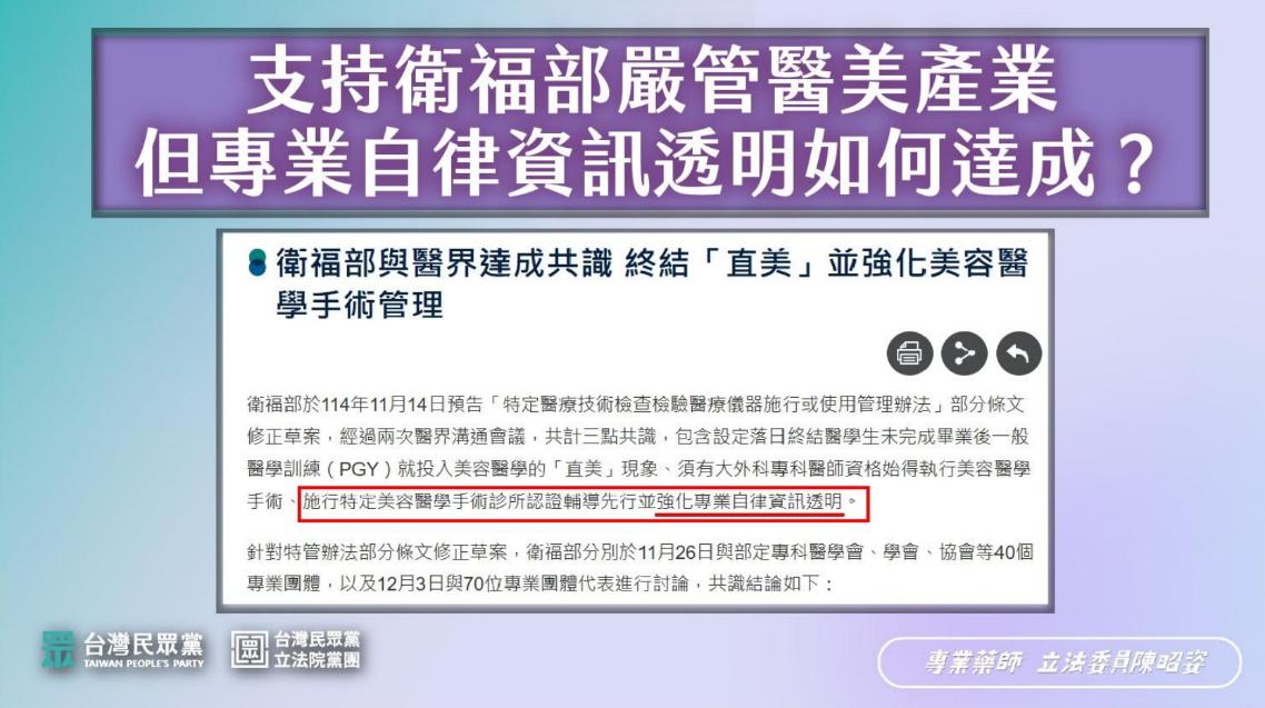 陳昭姿質疑,若違法行為發生在密閉手術室內,僅仰賴「關起門來的專業自律」是否真能防堵,行政調查往往也因證據有限而受阻,必要時仍須司法檢調介入,才能完整釐清責任。