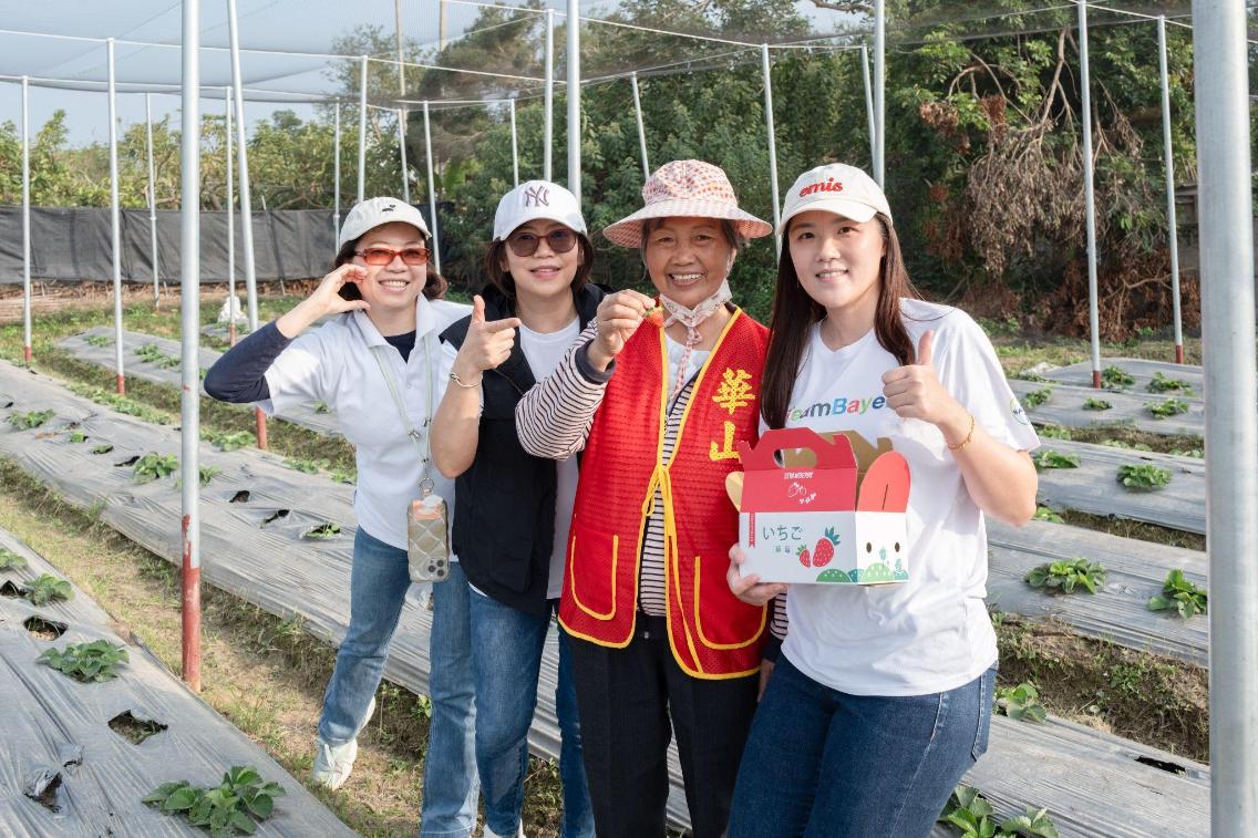 看見人口老化問題,台灣拜耳攜手堉睿科技,打造以農場為媒介的社會療癒模式,邀請華山基金會服務的長者加入草莓採收行列,員工主動找爺爺、奶奶茶飲交流,進一步了解長者的日常需求。