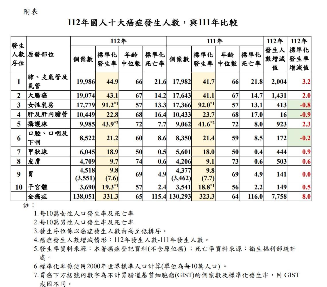 若分性別觀察,112年男性新發癌症人數為7萬1,244人,標準化發生率為每10萬人口350.8人,較前一年上升8.5人。