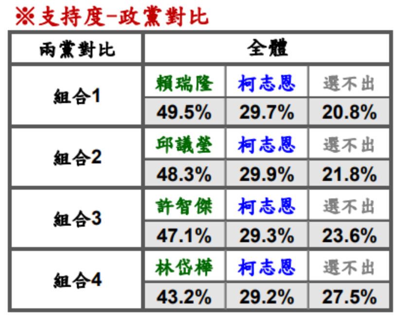 至於民進黨支持者的部份,賴瑞隆最獲得民進黨支持者的青睞,囊括37.2%支持;邱議瑩則緊追在後,囊括27.1%支持,後續依次為許智傑14.1%、林岱樺10.1%。
