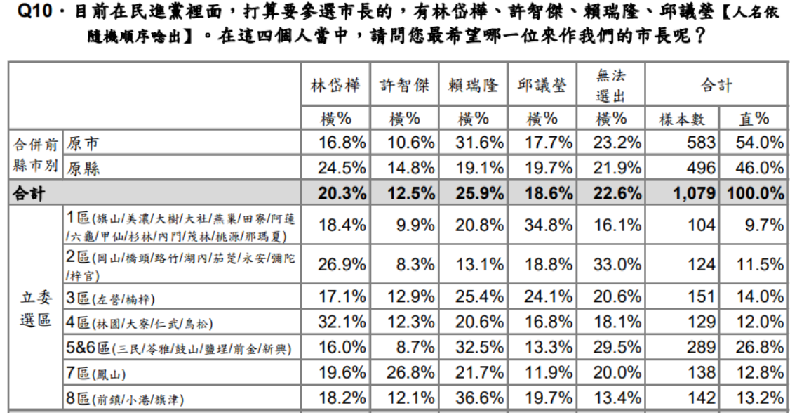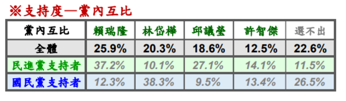 在黨內互比的情況下,賴瑞隆以25.9%同樣拔得頭籌。其後依序為:林岱樺20.3%、邱議瑩18.6%、許智傑12.5%,另有22.6%「選不出」。