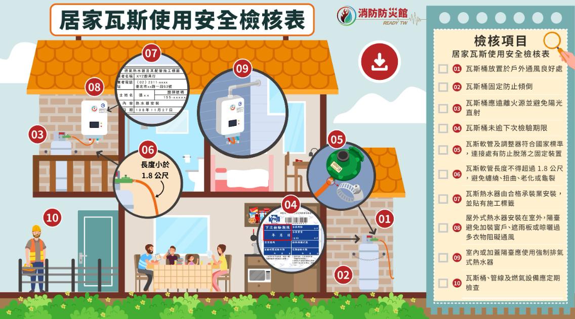 為提升市民防災意識,提醒民眾牢記口訣「順手推開窗,一氧化碳跑光光!」。使用燃氣熱水器時務必保持室內通風,避免因瓦斯燃燒不完全導致中毒。此外,安裝熱水器應遵守「5要原則」,包括「要安全品牌、要正確型式、要安全安裝、要定期檢修、要保持通風」,從源頭來降低風險。