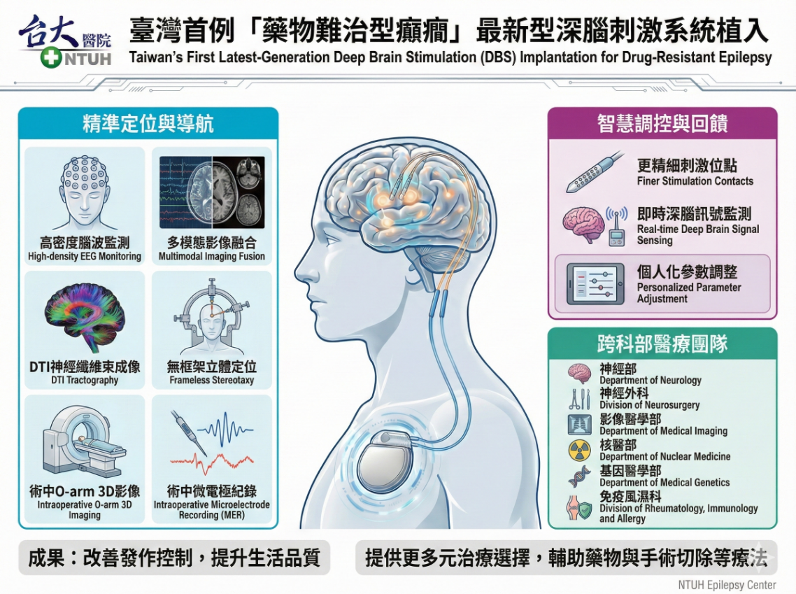 本案由台大醫院神經部癲癇中心主治醫師饒敦負責整體診療規劃,手術團隊則由台大神經外科主治醫師周聖哲與楊士弘共同執行,並整合影像醫學部主任陳雅芳、核醫部主治醫師顏若芳、基因醫學部主治醫師李妮鍾,以及內科部免疫風濕過敏科主治醫師沈玠妤等跨科專家,展現高度整合的團隊醫療模式。