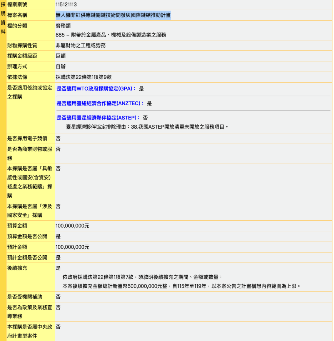 經濟部這項公告是以「無人機非紅供應鏈關鍵技術開發與國際鏈結推動計畫」為名,加上後續擴充案自115年至119年止,首次採取限制性招標,在決標時則準用最有利標,預計在8日開標。