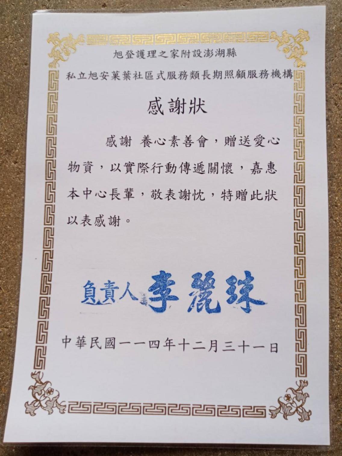 這張感謝狀,承載的不僅是物資的重量,更是素食社群對社會責任的堅定承諾,以及無數個生命被點亮的瞬間。(圖片來源/養心素善會)