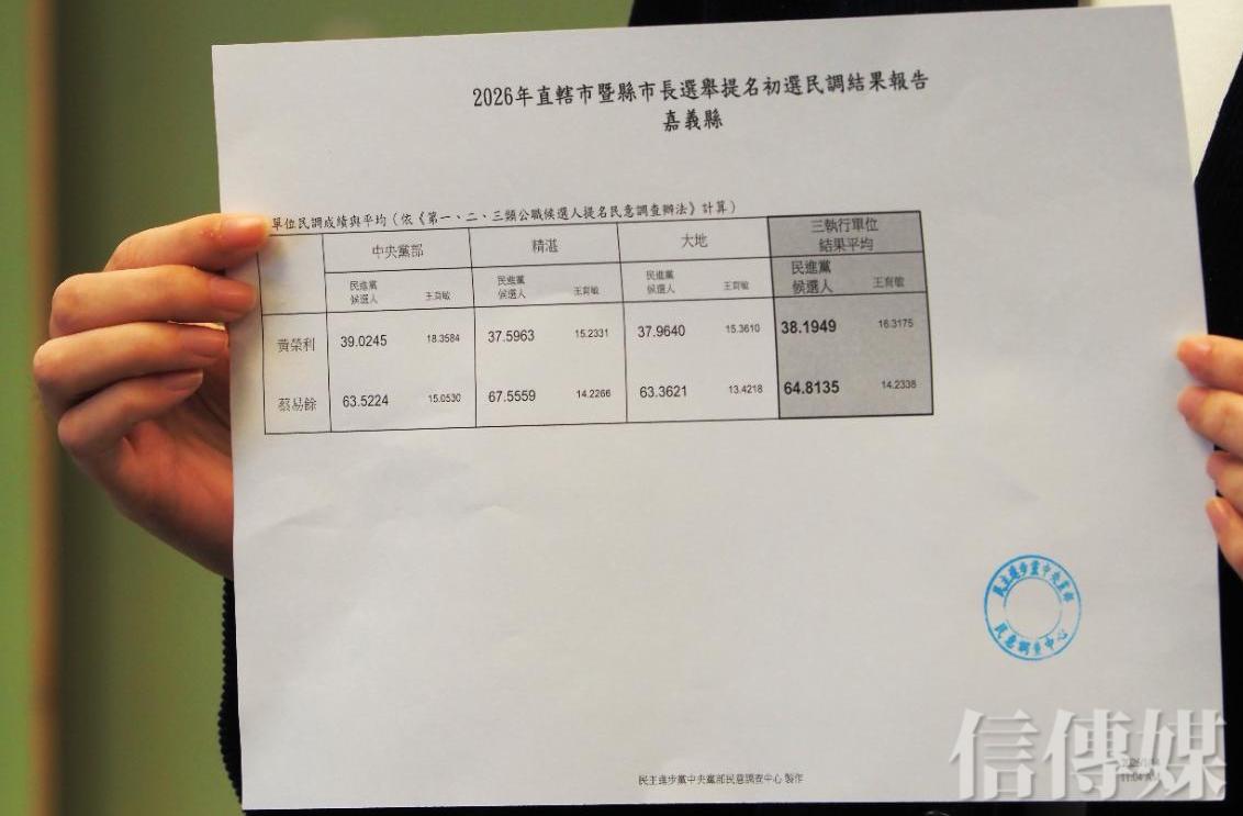 民進黨2026年直轄市長暨縣市長提名初選民調作業,本日由黨中央發言人韓瑩公布嘉義縣長初選民調結果,稍早由秘書長徐國勇指派副秘書長何博文全程和兩位候選人代表一起開封,同時將民調資料光碟與民調統計結果,簽名後一併給在場兩位候選人代表。民進黨強調,過程完全公開、公正,公平,且全程錄影。