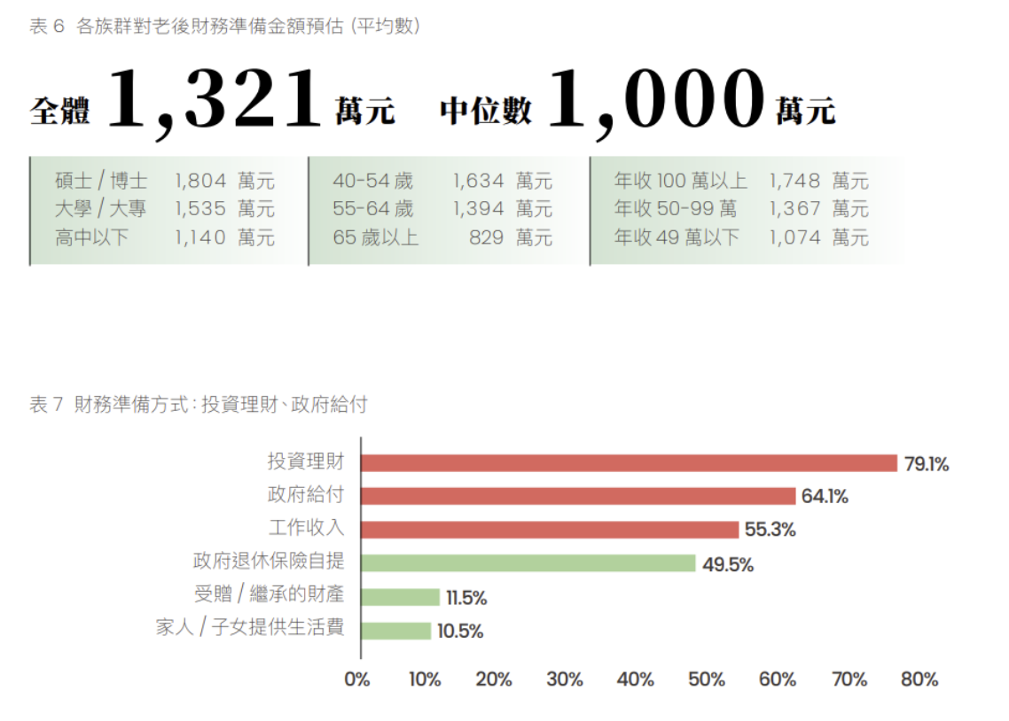 另外,研究亦指出,多數受訪者預估高齡生活需準備平均至少1,321萬新台幣,中位數也在1,000萬元。不過,以財務準備而言,有近三成沒有為老後財務做準備,年紀越輕、教育程度越低,投入準備的比例就越低。