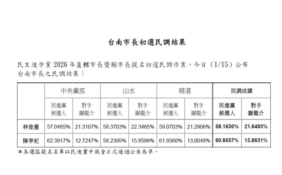 民進黨本週舉辦黨內初選民調,繼前兩日由立委賴瑞隆出線參選高雄市長、立委蔡易餘出線參選嘉義縣長,台南市長初選民調於本(15)日壓軸登場,結果由立委陳亭妃以些微差距勝出。