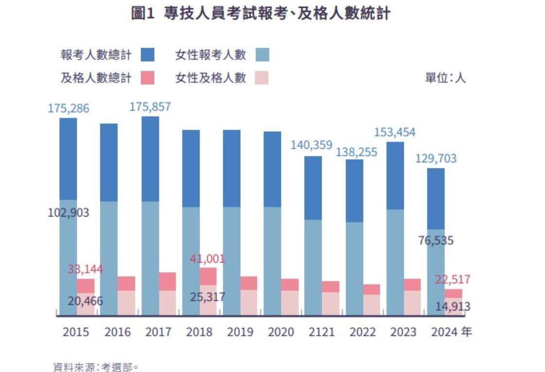 在及格人數方面,2018年達4.1萬人,為近十年最高,2024年降至2.2萬人為最低。近十年及格人數年平均約3.2萬人,女性平均占62.5%,略高於其報考占比58.5%,顯示女性在整體考試表現上相對較優(圖1)。