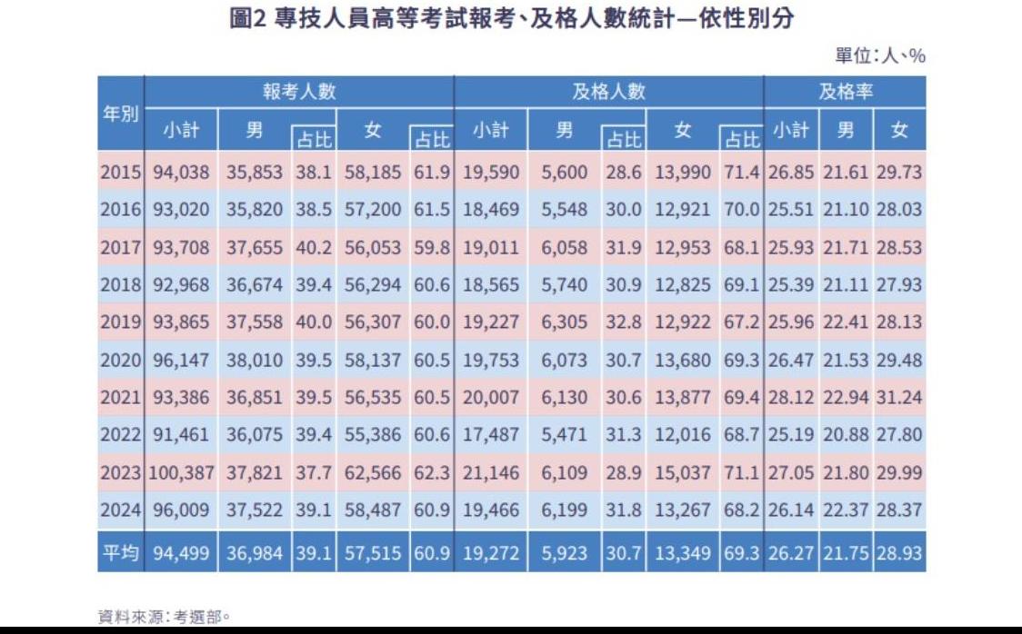本文透過系統性統計分析,觀察專技人員考試中的性別參與狀況,並探討其與教育端的關聯性,期能提供客觀的數據基礎,促進專業人才的均衡發展。