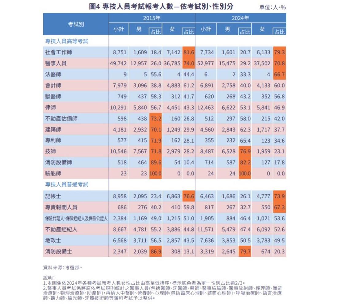 高等考試以社會工作師、醫事人員等考試為代表,女性報考比率均超過70%,這些領域傳統上被視為「照護型」專業,與女性的社會角色期待相符。2024年社會工作師考試女性報考占79.3%,醫事人員考試占70.8%(主要受護理師考試影響),與2015年比較,兩者之女性占比分別下降2.3個百分點、3.2個百分點。