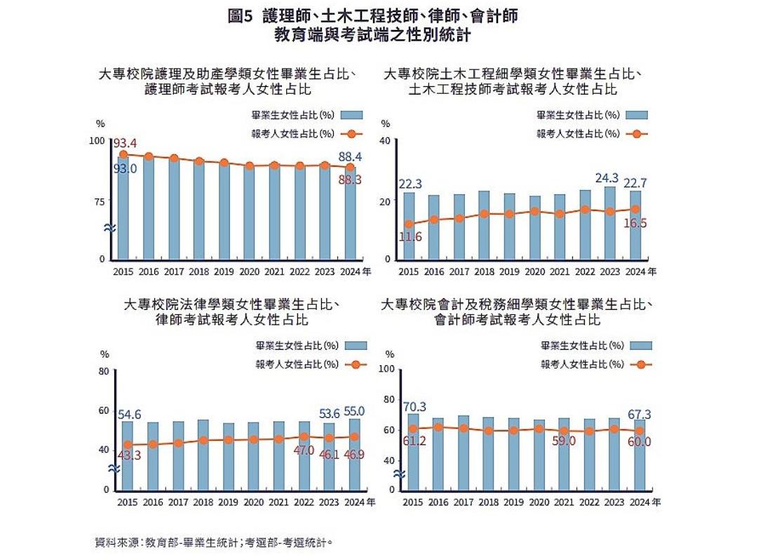 從專技人員考試統計資料的變化,可以發現越來越多女性進入傳統男性主導的專業領域,同時也有更多男性投入傳統女性主導的領域;此舉也體現了我國在性別平等教育上的成果,未來專業人力資源將更加均衡多元,有助於提升整體社會的創新能力與競爭力。