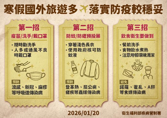 疾管署強調,寒假旅遊放鬆之餘,防疫意識不可鬆懈,無論是在國內活動或海外旅遊,做好基本防護,才能平安過假期。