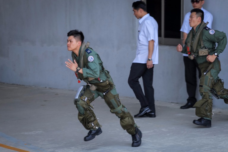 在總統的視導下,現場模擬敵機來犯,機棚警鈴大作,飛行員快速奔出,進行極速升空作戰。