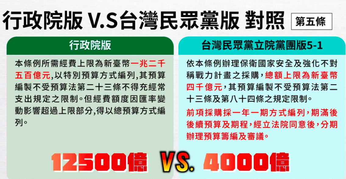 民眾黨立法院黨團今(26)日公布黨版軍購特別條例,將行政院版金額上限1.25兆元,大砍至4000億元,並規定採購採一年一期方式編列,期滿後須經立法院同意後,分期辦理預算籌編及審議。