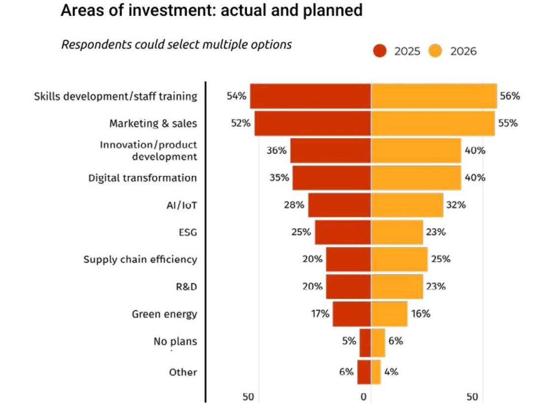 人工智慧和物聯網的實際投資遠遠超出預期。2024年調查中,只有12% 的受訪者預計在2025年投資這些技術,而實際投資比例達到了28%,高於前一年的10%,比預期高出16個百分點。展望未來,這一勢頭似乎將持續,32%的受訪者表示計劃在2026年投資人工智慧和物聯網。