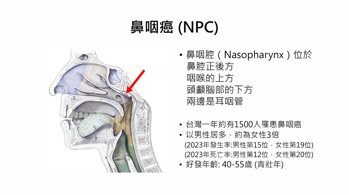 根據台灣癌症登記資料,鼻咽癌好發於40-55歲,男性約為女性的3倍,但30歲以下患者並不少見,甚至可見青少年與兒童病例。