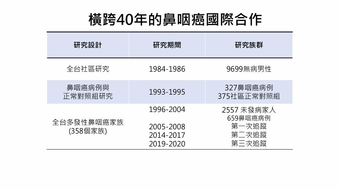 台大醫院鼻咽癌研究團隊,橫跨40年,結合台灣大學、中研院、美國國家癌症研究院與全台六家醫學中心,建立全球少見的大型追蹤研究。早在1980年代,團隊即追蹤近萬名健康男性,證實血清抗EB病毒抗體陽性者,長期罹患鼻咽癌的累積發生率顯著升高,成果發表於《新英格蘭醫學期刊》。