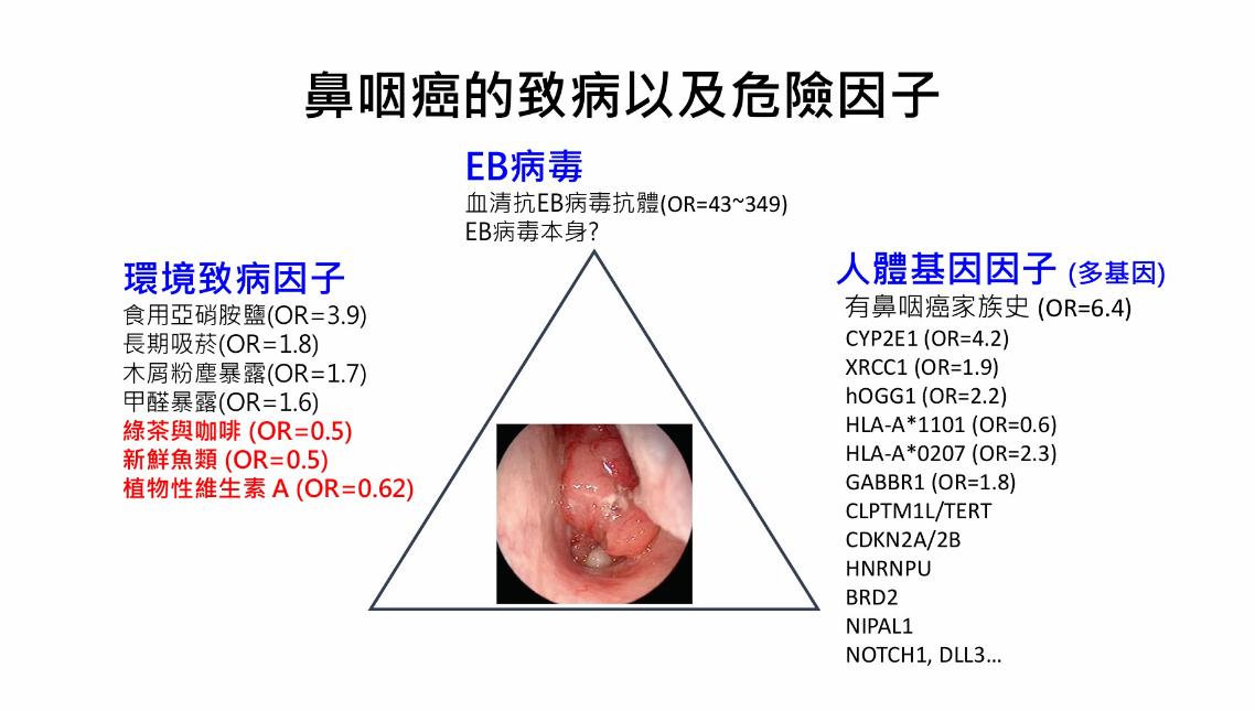根據研究顯示,有鼻咽癌家族史者,罹癌風險是一般人的6倍以上,且發病年齡往往偏年輕。「但臨床上仍有不少年輕患者沒有家族史,顯示鼻咽癌並非單一因素造成,而是病毒、基因與環境共同作用的結果。」