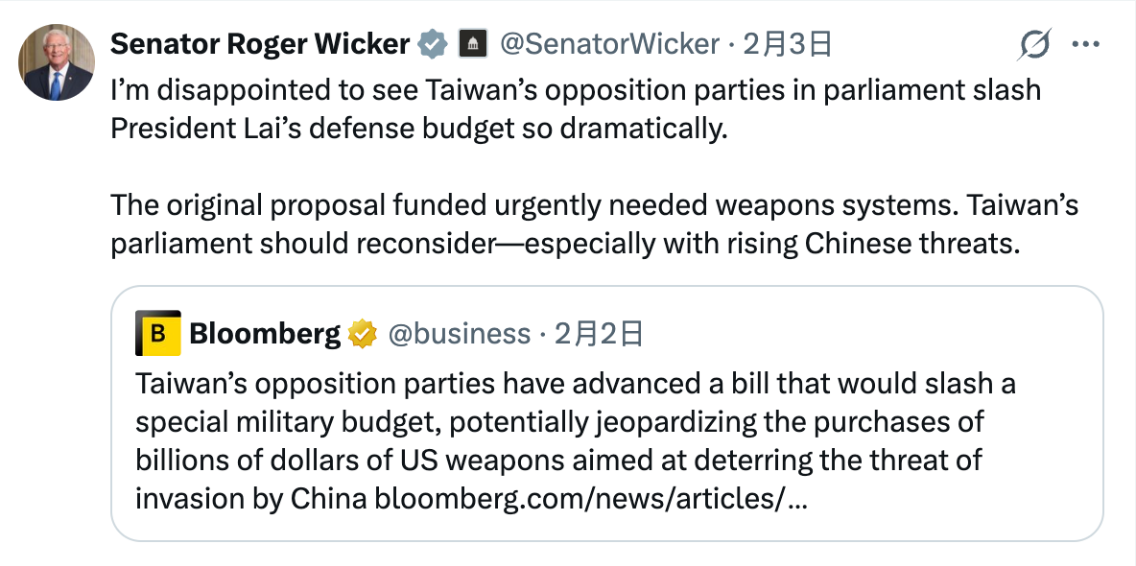 外部則有美方對台施加壓力,美國參議員羅傑・威克(Roger Wicker)與丹・沙利文(Dan Sullivan)近日如先後在社群平台發文,直接點名在野黨大幅削減賴清德所提出的國防特別預算,並對立法院未能通過台灣自衛所需預算表示失望。