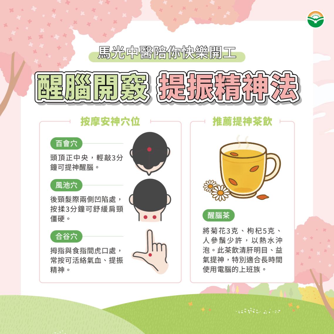 回到辦公室,最常聽到的就是「你怎麼還沒清醒?」這時可運用中醫穴位按摩與茶飲提神醒腦,讓耳聰目明。