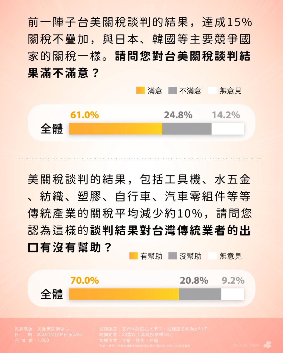 吳崢續指,民調進一步詢問關稅談判結果裡頭包括工具機、水五金、紡織、塑膠、自行車、汽車零組件等傳產關稅平均減少約10%,有高達70.0%民眾認為對傳產出口有幫助,僅20.8%認為沒幫助。