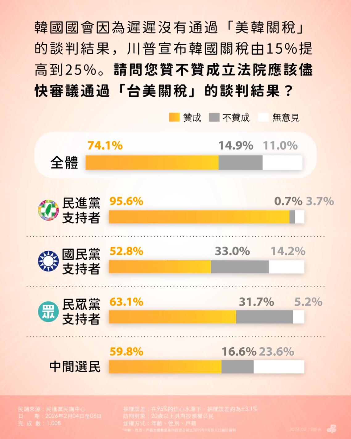 吳思瑤呼籲,民調具體數字已說明當前經貿路線方向,在野黨應正視跨黨派、跨世代的民意,切勿讓國會審議成為台灣經貿前進的阻力,應順應民意儘速通過台美談判成果,為台灣傳產與供應鏈安全爭取先機。