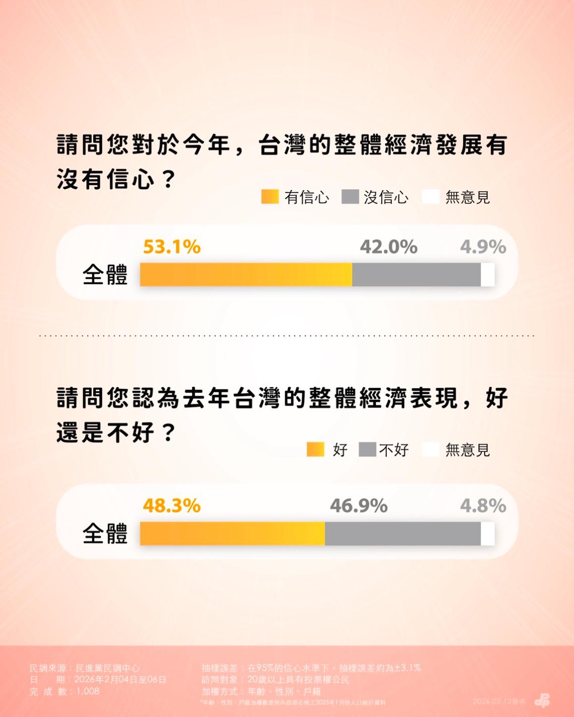 吳崢並且說明,本日公布民調係由民進黨中央黨部民調中心執行,執行日期是在今年2月4日至6日,針對20歲以上有投票權之公民,共完成1008份電話調查樣本,於信心水準95%之下,抽樣誤差為±3.1%。