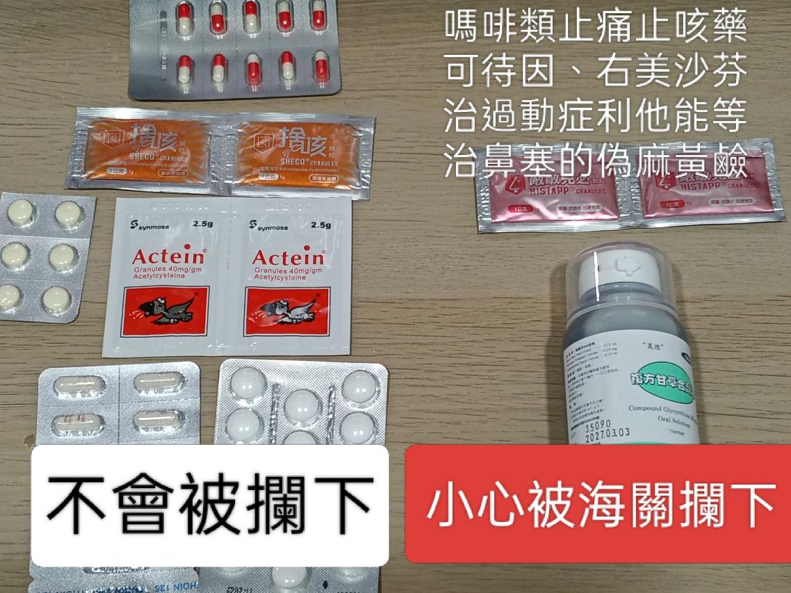 「常見的感冒藥、止瀉藥、過敏藥在台灣都是日常用藥,但到了不同國家可能屬於受管制的藥品。如果沒有事先查詢規定、準備文件或英文處方,海關隨時有權攔查。」