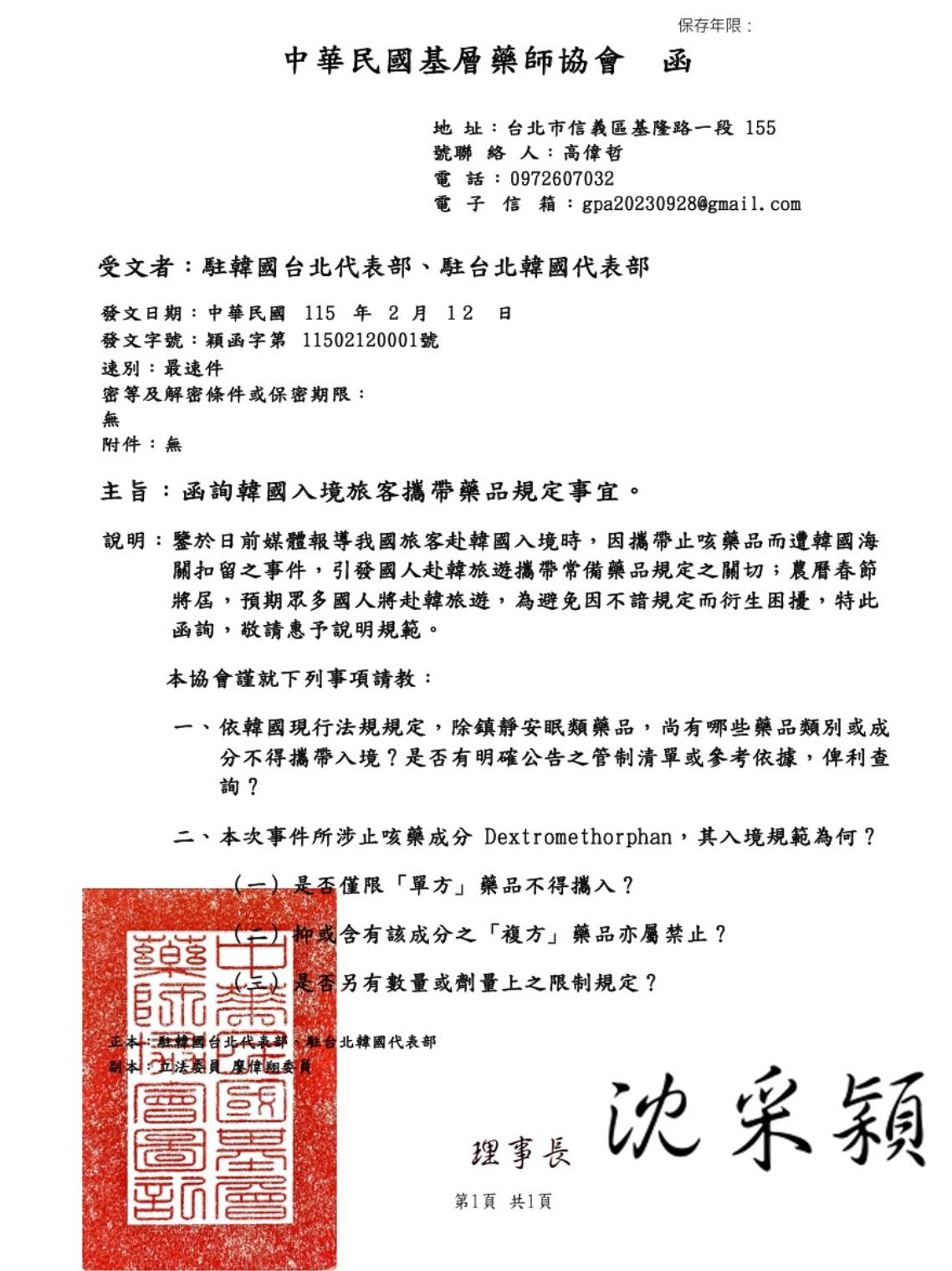 「政府應該要提供給民眾充分的資訊,以免出國觸犯他國的法律!基層藥師協會今天新聞給韓國辦事處詢問。」函文內容包括本次事件所涉止咳藥成分Dextromethorphan,其入境規範為何?是否僅限「單方」藥品不得攜入?抑或含有該成分之「複方」藥品亦屬禁止?是否另有數量或劑量上之限制規定?