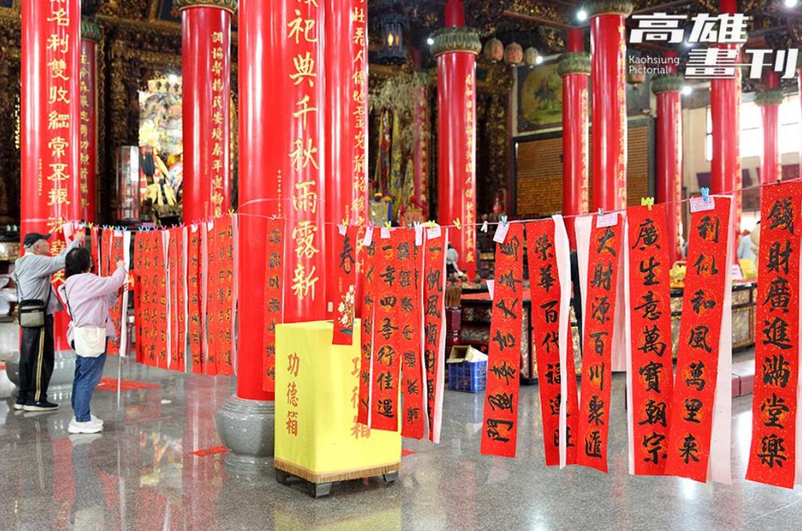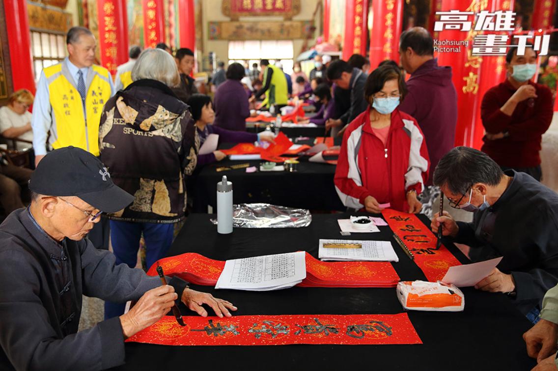 當第一筆落下,原本喧囂的人聲似乎都隱退了。陽光透過廟簷灑下,在紅紙上映出層層疊疊的人影。有的老師運筆如風,有的凝神勾勒花鳥,筆鋒摩挲紙面的沙沙聲,與廟裡的鐘鼓聲、人們的讚嘆聲,共同譜成一曲迎春納福的樂章。