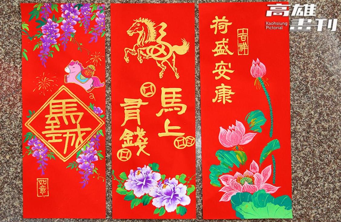 走進揮毫現場,除了傳統吉祥話,紅紙上還綻放著牡丹、荷花、野薑花,甚至是可愛的Q版生肖圖案。