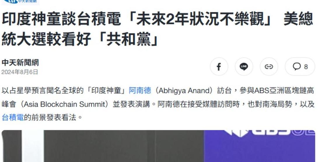 2025年是各大預言家有「共識」的一年,全球大戰爭、天災、人口減少,其中,比較具體的要算是自稱以占星學預言聞名全球的「印度神童」阿南德(Abhigya Anand),他在2024年8月訪問台灣時對媒體說,台積電將會在「2025年」遇到挑戰,主要是接下來2年看起來「狀況不太好」。
