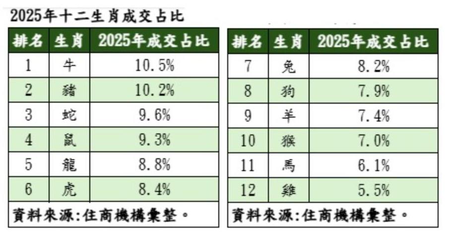 根據統計,2025年交易的買方中,以屬牛者占比達10.5%位居第一,屬豬者則以10.2%緊追在後。賴志昶分析,2025年受限貸令衝擊,許多買方面臨貸款成數緊縮而卻步,惟屬牛者性格多半執著且務實,普遍有儲蓄習慣,深厚的自備款實力,成為房市寒流中最大優勢;而屬豬者則展現逆向的投資哲學,在市場觀望氣氛濃厚時,反而逆向操作而在危機入市,使其穩坐成交高位。