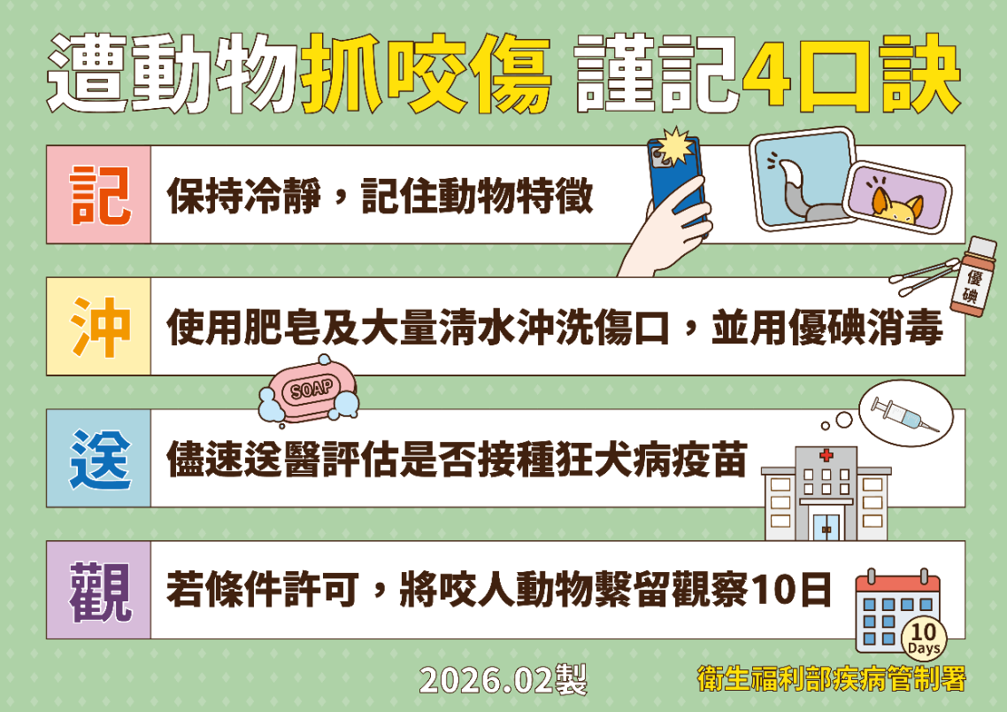 疾管署強調,若不慎遭野生動物抓咬傷,務必立即採取以下步驟: