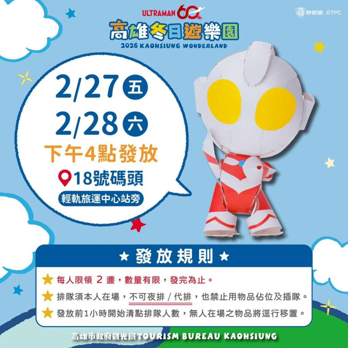為了把握最後的連假人潮,高雄市政府特別在228連假期間準備了專屬驚喜。2月27日與2月28日將在高雄港18號碼頭發放限量的「超人力霸王造型小提燈」,數量有限,領完為止!