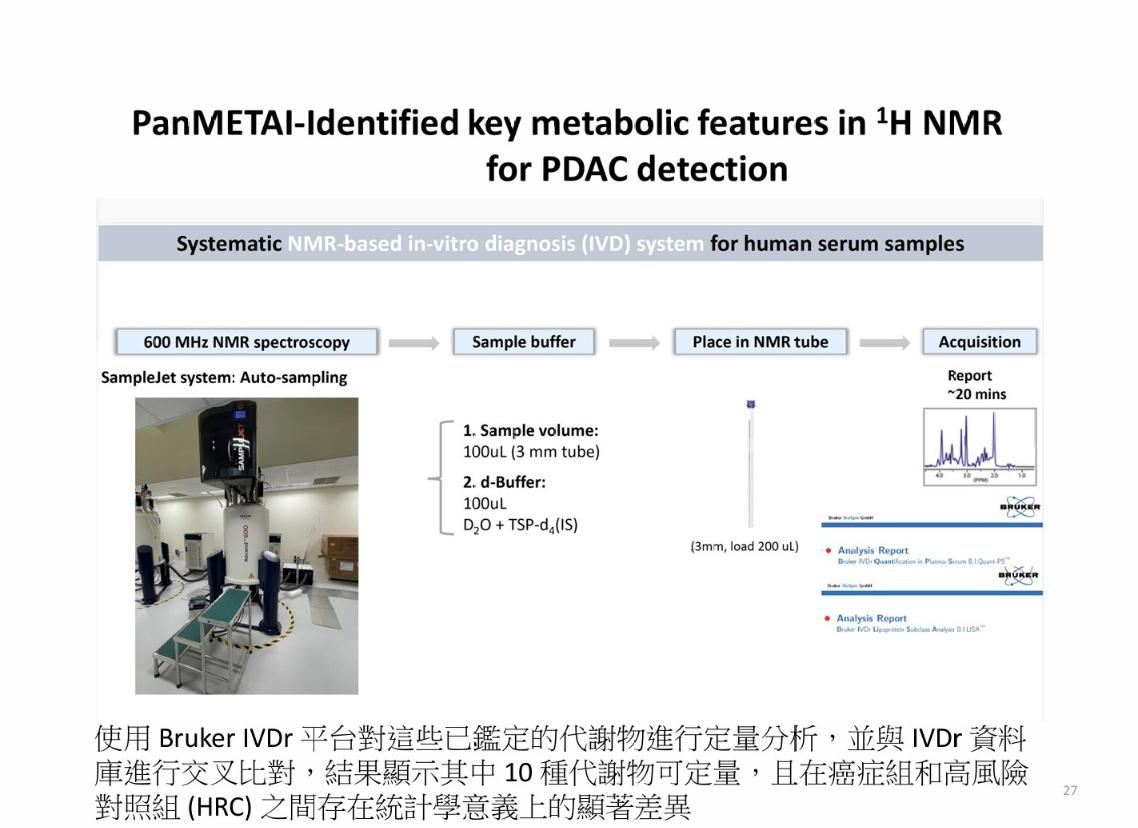 研究團隊利用600 MHz核磁共振(¹H NMR)代謝體分析平台,每位受試者僅需110微升血清,即可產生約13萬個代謝訊號特徵。這些訊號經標準化處理與特徵選擇後,結合臨床指標(如年齡、CA19-9、Activin A等),輸入AI模型進行整合分析。