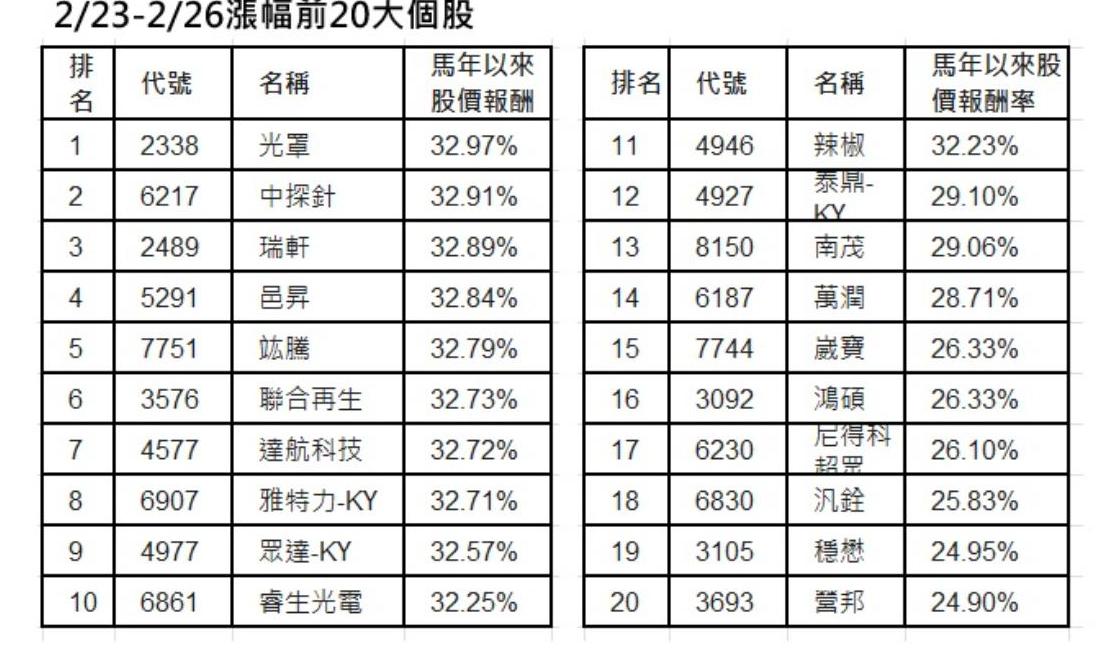 農曆馬年春節假期結束後,台股上演波瀾壯闊的「馬到成功」行情。當市場目光仍聚焦在權王台積電的穩健表現時,中小型股早已按捺不住寂寞,開啟了瘋狂狂飆模式。根據最新統計,馬年開紅盤首週,漲幅前 20 名的企業名單出爐,前 11 名個股在短短四個交易日內,報酬率全數突破 30%,以「一馬當先」的速度遠遠甩開大盤與權值股。