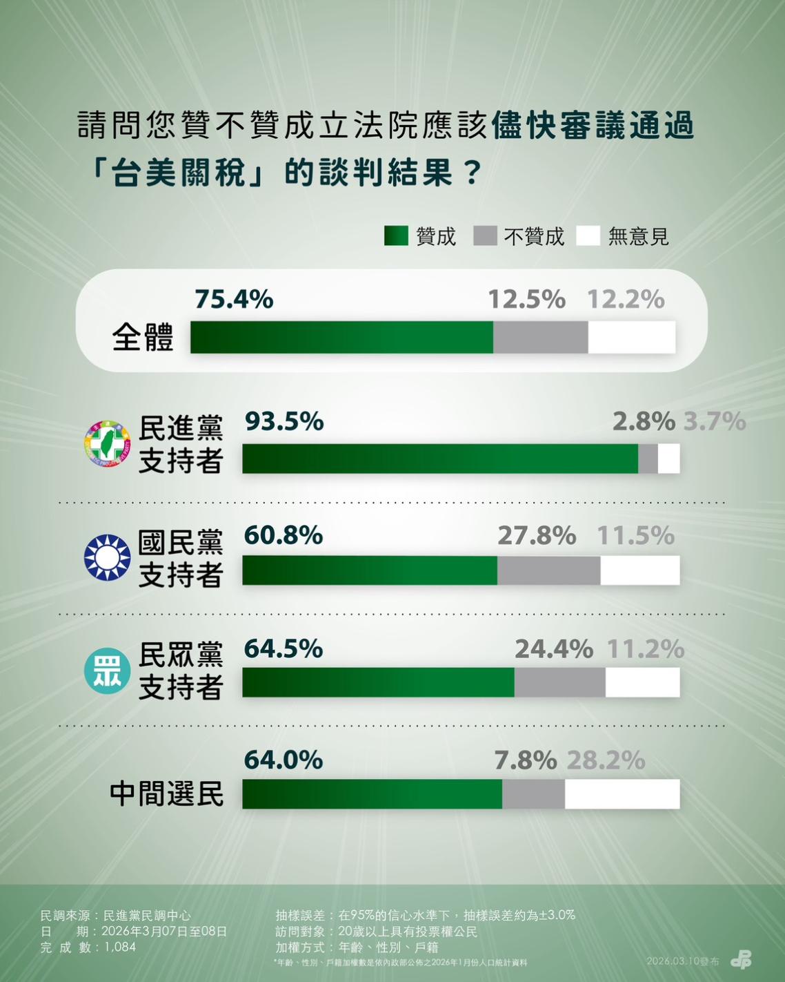 最後,針對台美關稅協議,民進黨民調顯示,整體有75.4%民眾贊成立法院應該盡快審議通過台美關稅的談判結果,僅12.5%反對,另有12.2%無意見。