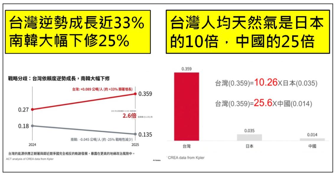 高雄健康空氣行動聯盟理事長黃義英表示,目前台灣天然氣存量約11至14天,且高度依賴進口,一旦國際衝突影響航道,能源供應可能面臨風險。