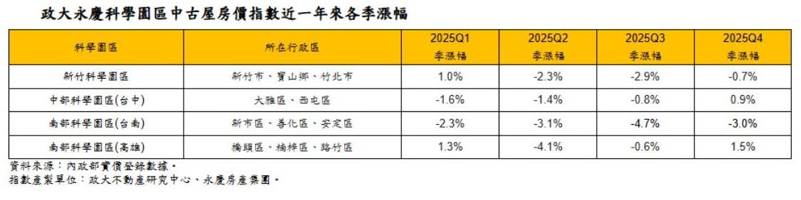 2025年第四季最新「政大永慶科學園區中古屋房價指數」出爐。數據顯示,歷經前幾季修正後,科學園區房市本季呈現由跌轉盤整態勢。其中,台中科學園區季漲0.9%、高雄園區季漲1.5%,新竹園區跌幅縮小至0.7%,而台南園區仍季跌3.0%,連續四季下修。