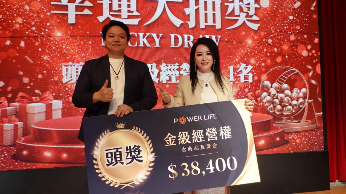 廣生堂集團力量國際健康POWER LIFE首屆春酒活動獎項豐富!由王靜美董事長(右)抽出幸運兒,頭獎價值$38400的金級經營權,包含商品及獎金,是最高獎勵,也是鼓勵!(照片來源/廣生堂集團)