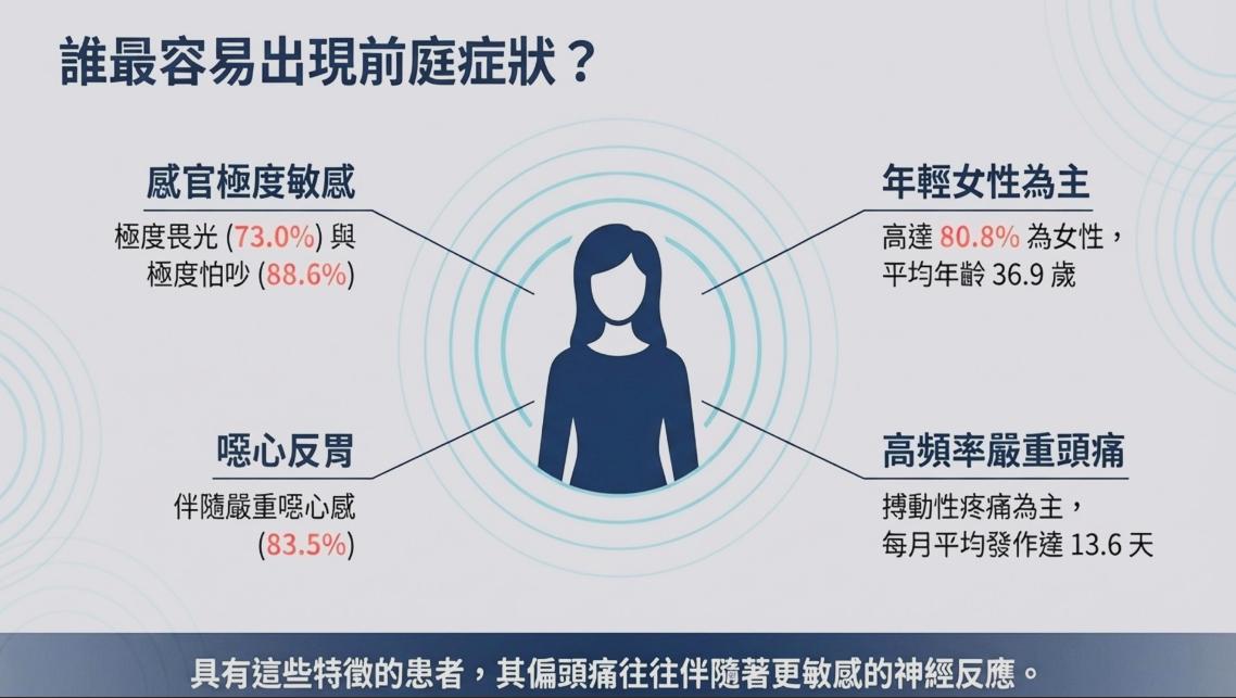 根據北榮研究團隊分析,較容易出現前庭症狀的偏頭痛患者,往往具有特定臨床特徵。整體而言,以年輕女性為主,女性占比高達80.8%,平均年齡約36.9歲;在症狀表現上,患者多伴隨高度感官敏感,包括畏光(73.0%)與怕吵(88.6%),同時也常出現明顯噁心反胃(83.5%)。此外,這類患者的頭痛型態多為搏動性疼痛,且發作頻率偏高,每月平均可達13.6天。