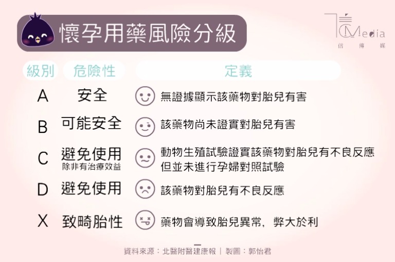 在孕期的第二期(即為懷孕第3-8週)為胎兒對藥物影響最敏感的時期。自2015年7 月起,FDA 改成以文字敘述,希望能提供更多關於懷孕、授乳及對生殖能力影響的相關資訊。但許多已上市藥物的懷孕用藥風險標示尚未完全變更完成,因此目前臨床仍可參考懷孕用藥風險分級,分類如表格: