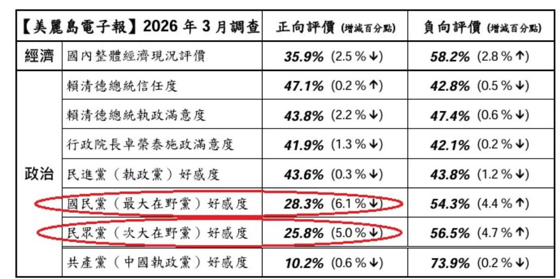 《美麗島電子報》公布2026年3月最新國政民調顯示,雖然三大黨的好感度都下跌,但柯文哲貪汙案宣判17年重創選民對於民眾黨和國民黨好感度,柯文哲個人信任度也大跌9%。
